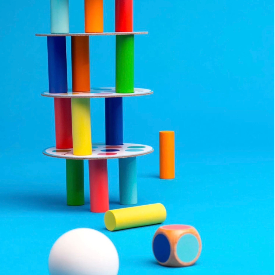Construisez la tour la plus haute possible. A tour de rôle, ajoutez les cylindres en fonction de la couleur indiquée par le dé sur les plateaux ronds, tout en évitant que la tour ne tombe. Jeu de la collection Les Loufoques. 2 joueurs et +. 4 ans et +